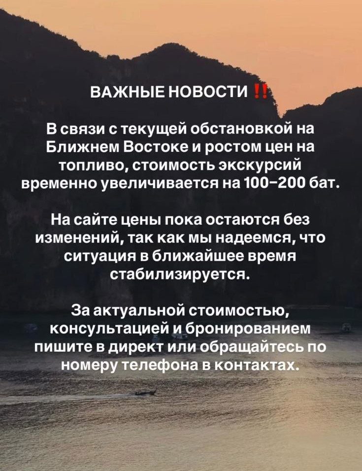 - За любые изменения в ваучере, которые влекут его замену (уменьшение количества участников, изменение данных, даты, отказ от бронирования и т.п.) - возможны не менее чем за 48 часов до начала экскурсии. В этом случае мы удержим 500 бат с человека.